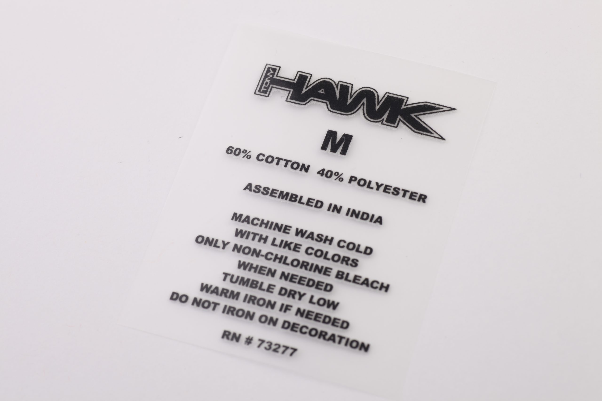 Le etichette a trasferimento termico utilizzano il calore e la pressione per trasferire il disegno dell’etichetta, il marchio o le istruzioni di manutenzione direttamente sul tessuto dell’indumento. Questo processo crea una finitura liscia e priva di supporto, che si appoggia al tessuto, rendendola ideale per i capi in cui il comfort è una priorità, come l’activewear, la biancheria intima, l’abbigliamento per bambini e le tshirt.